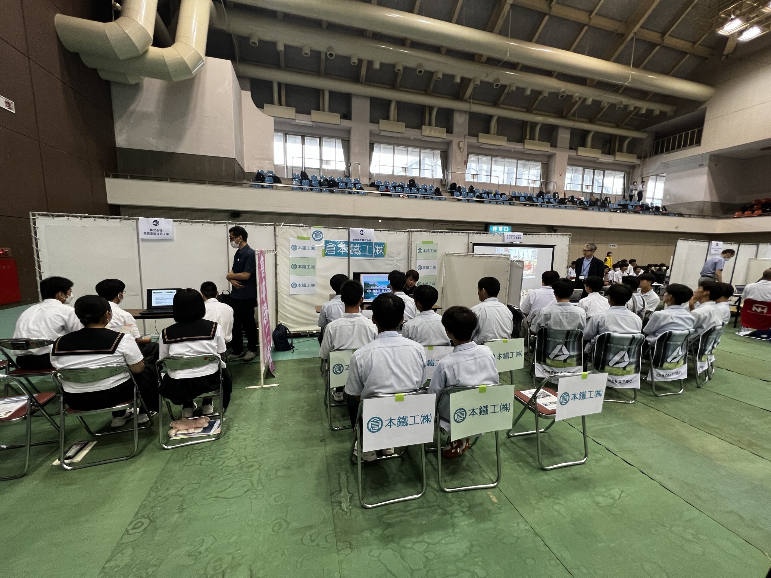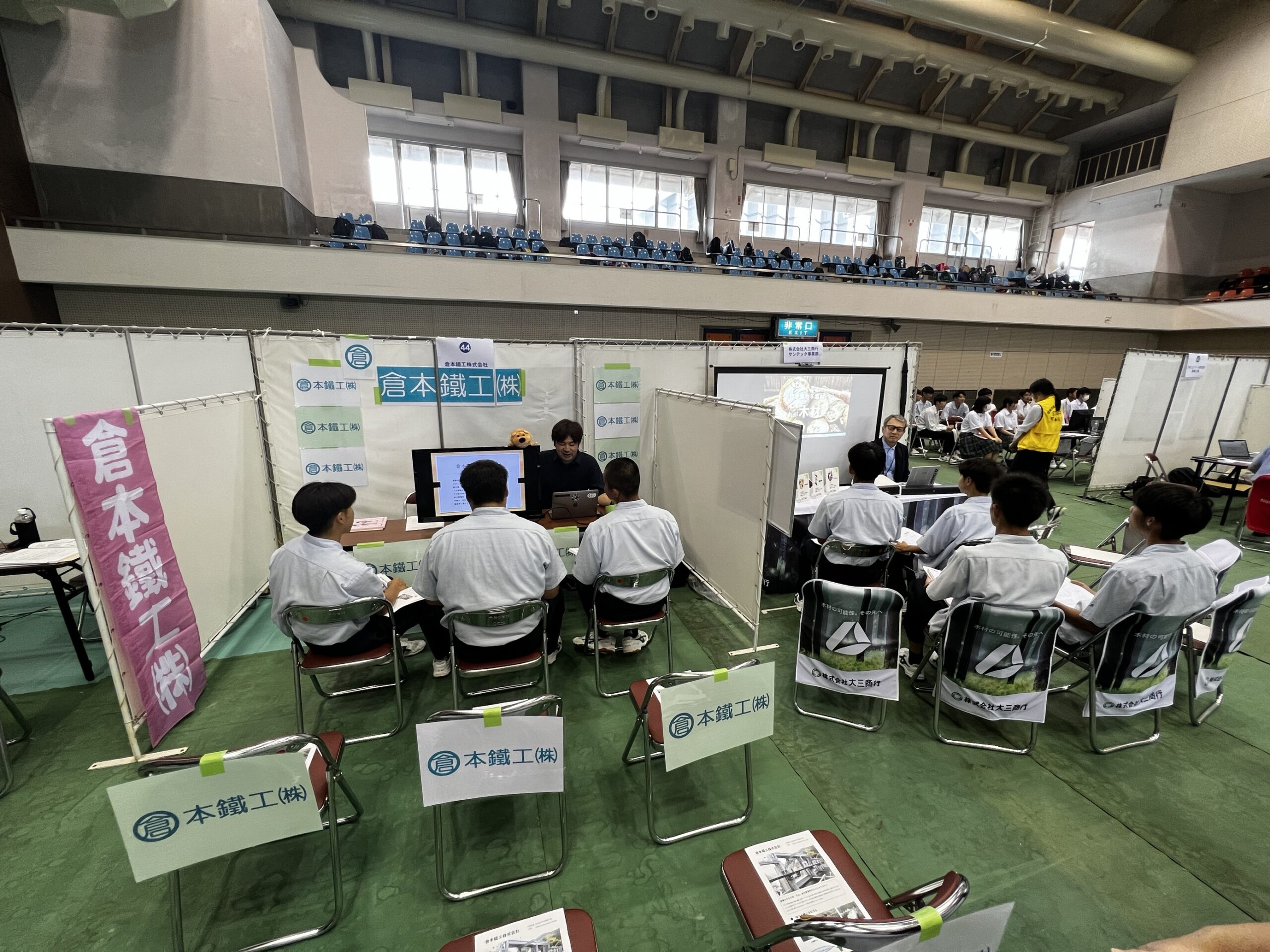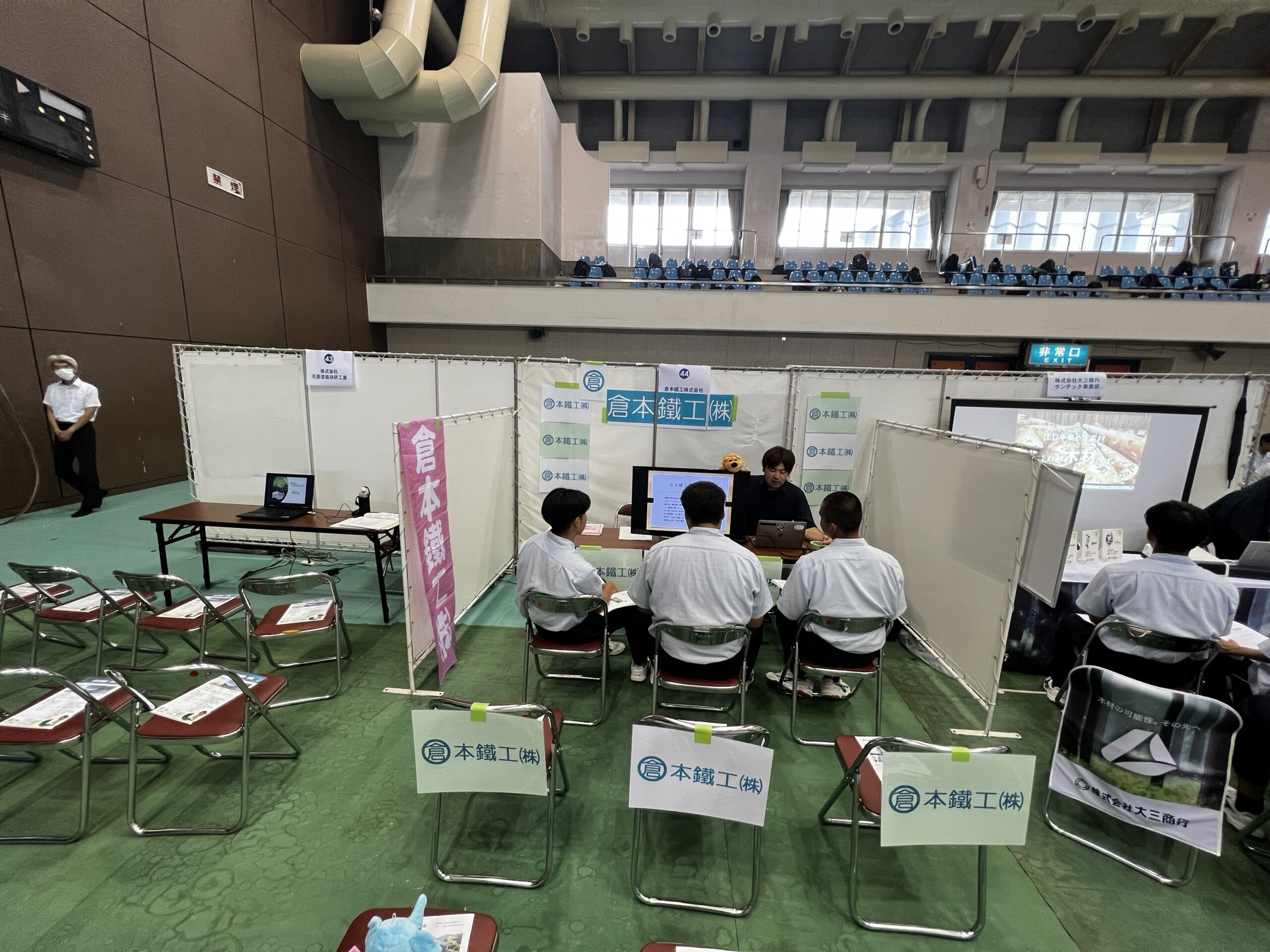 今回は宮崎県北50社ほどがブースを出展しており、弊社からは2名が送り込まれ、ブースの設営から学生様へのプレゼンまですべてに奮闘しました!