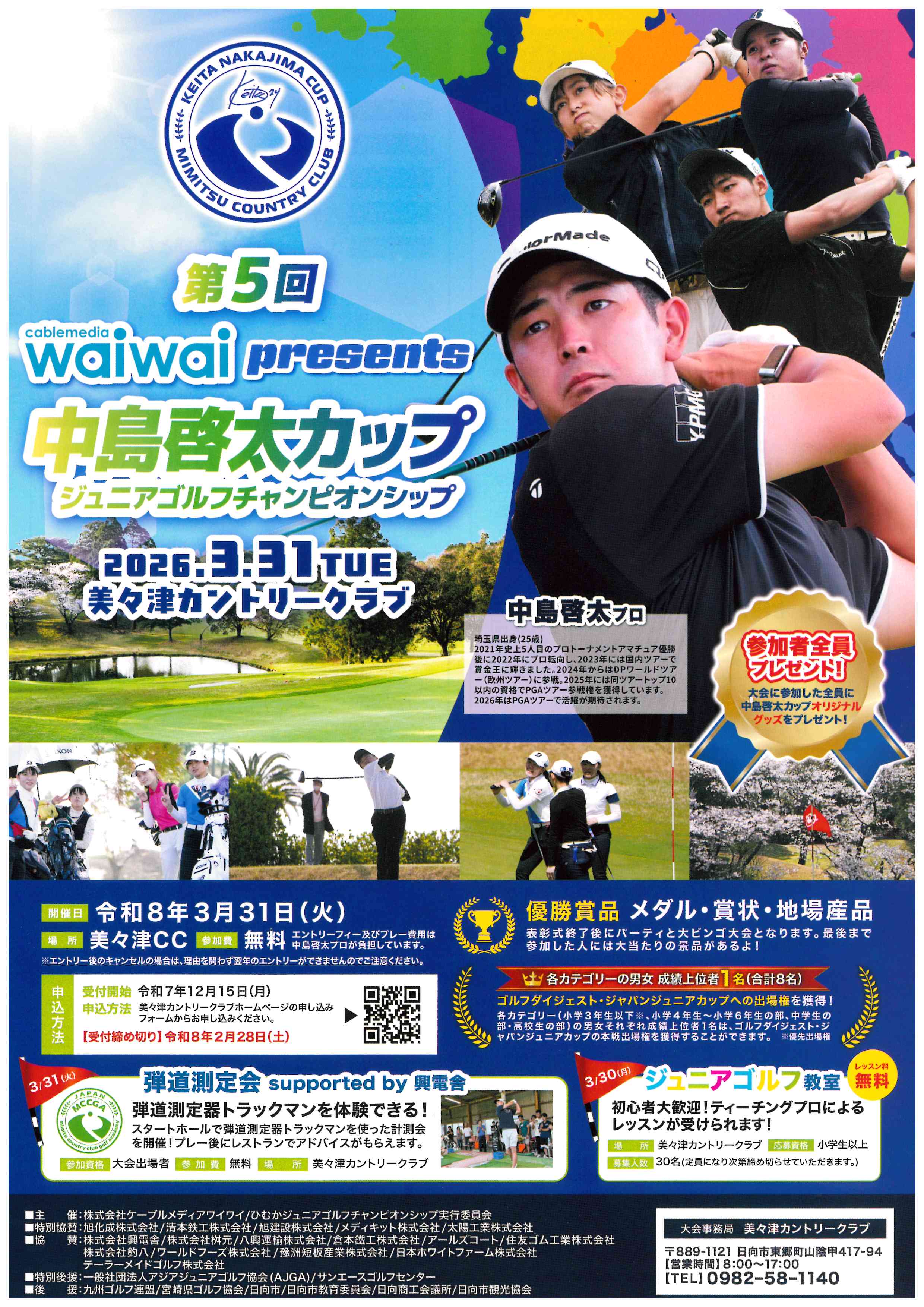 ホーム お知らせ 中島啓太カップジュニアゴルフチャンピオンシップ 2026年3月31日 ニュース 中島啓太カップジュニアゴルフチャンピオンシップ 倉本鐵工は、3月31日(火)に美々津カントリークラブにて開催された、 「waiwai present 第5回中島啓太カップジュニアゴルフチャンピオンシップ」に スポンサーとして協賛しました! 倉本鐵工は頑張るジュニアゴルファーを応援します! << 前の記事 次の記事 >> 記事一覧はこちら ›
